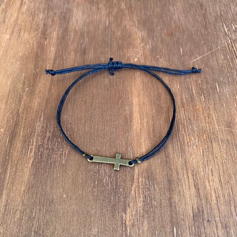 A thin bracelet that is very light and comfy to wear. You won’t even know it’s on! Adjustable to fit almost any size wrist. Finished with a rustic metal cross charm and available in your choice of black or brown rope.