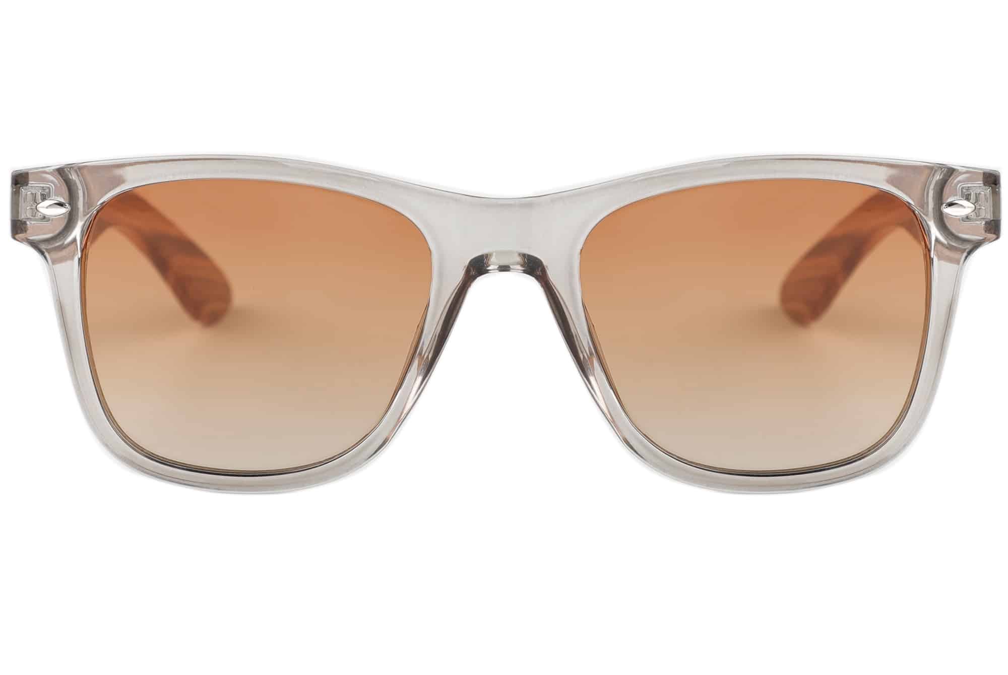 Our Runaway Haze model has a classic styling with a transparent frame and real wooden arms. Finished with brown UV400 polarised lenses for maximum sun protection.